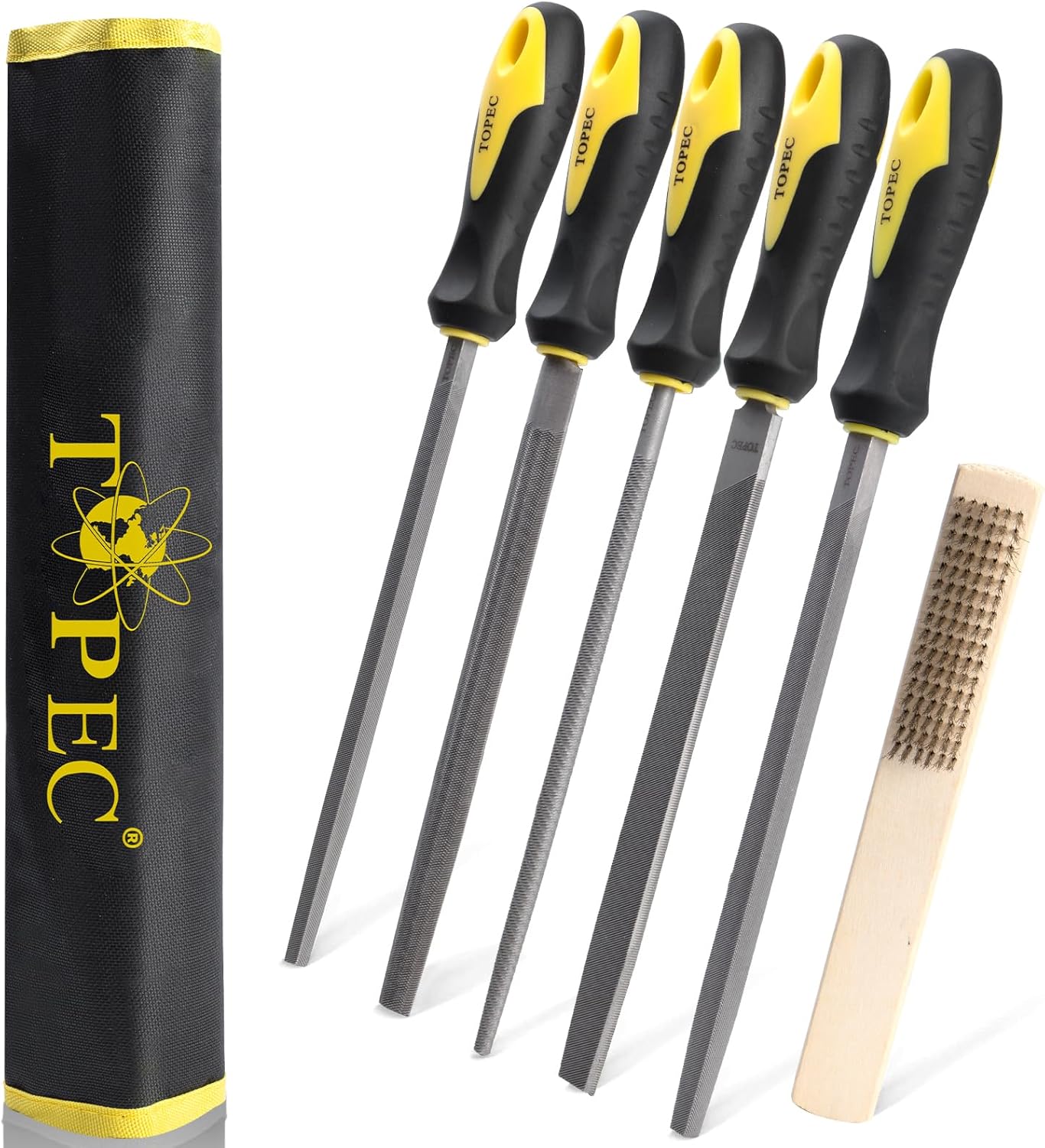 Topec Metal File Set, 6Pcs High Quality File Set, 8-inch High Carbon Steel Round File, Square File, Half-Round File, Triangular File, Flat File with Brush and Rolling Pouch, for Wo...